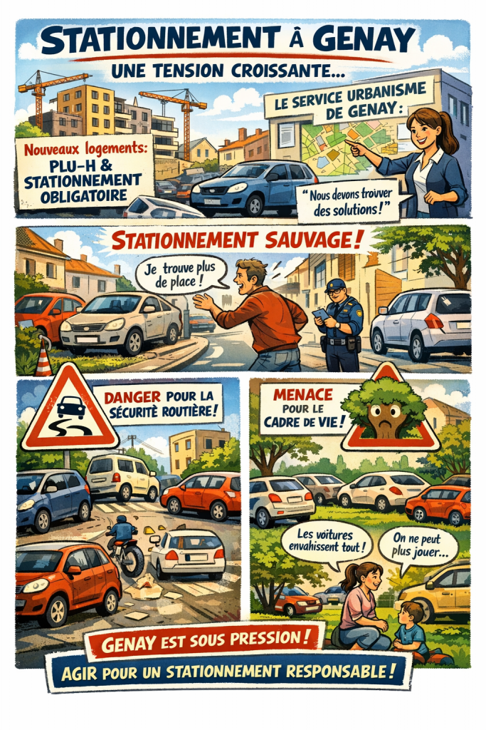 Le stationnement est devenu, dans la plupart des communes françaises, l’une des premières sources de tension quotidienne entre habitants. À Genay comme ailleurs, l’arrivée de nouveaux logements fait mécaniquement augmenter la pression sur l’espace public : les rues se remplissent, les trottoirs se transforment en parkings improvisés, et la sérénité du village s’effrite.